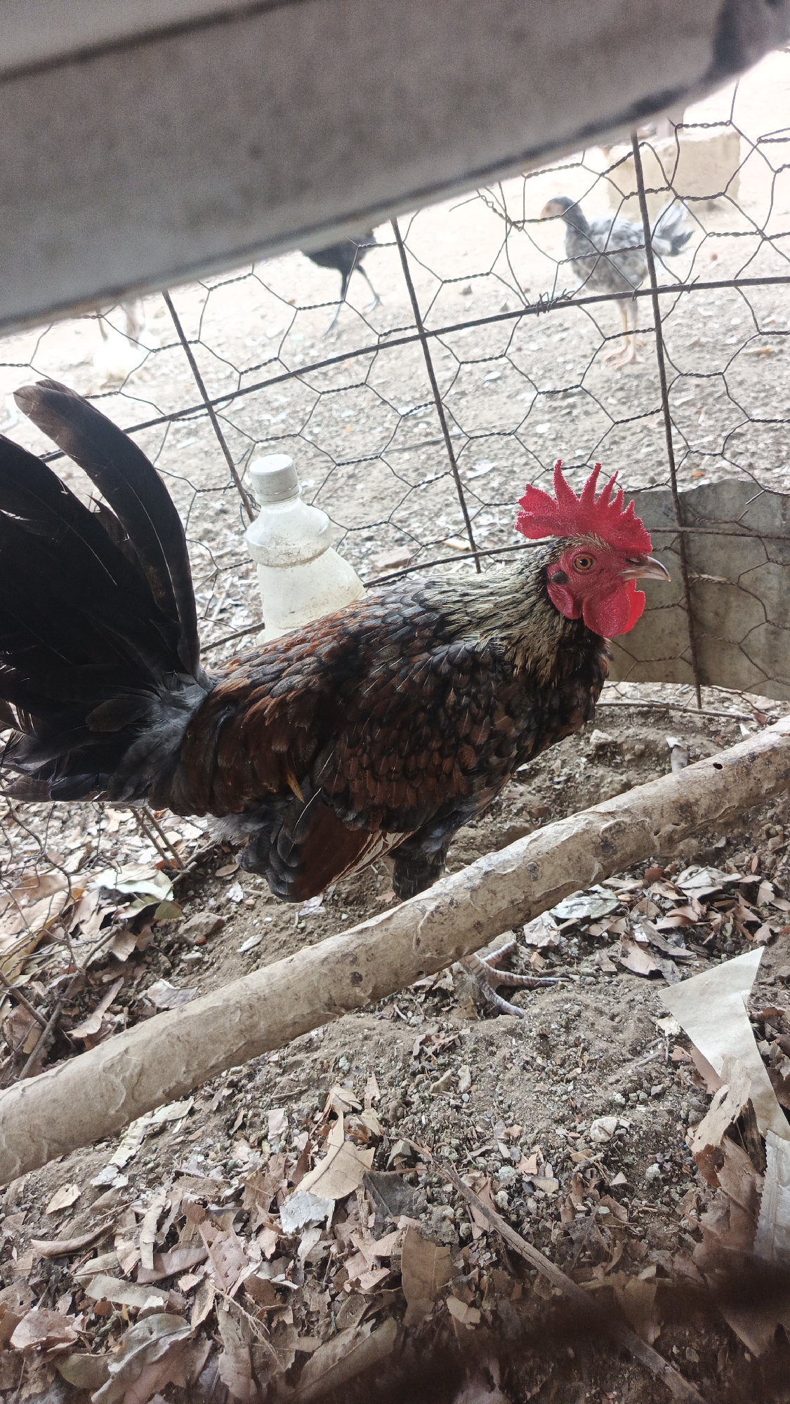 The image depicts a rooster standing in an enclosure in La Tagua, Venezuela