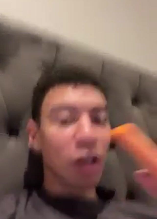 A young man with curly hair is lying on a gray, tufted headboard, wearing a gray T-shirt. He takes a bite of a carrot and then gestures with it towards the camera.