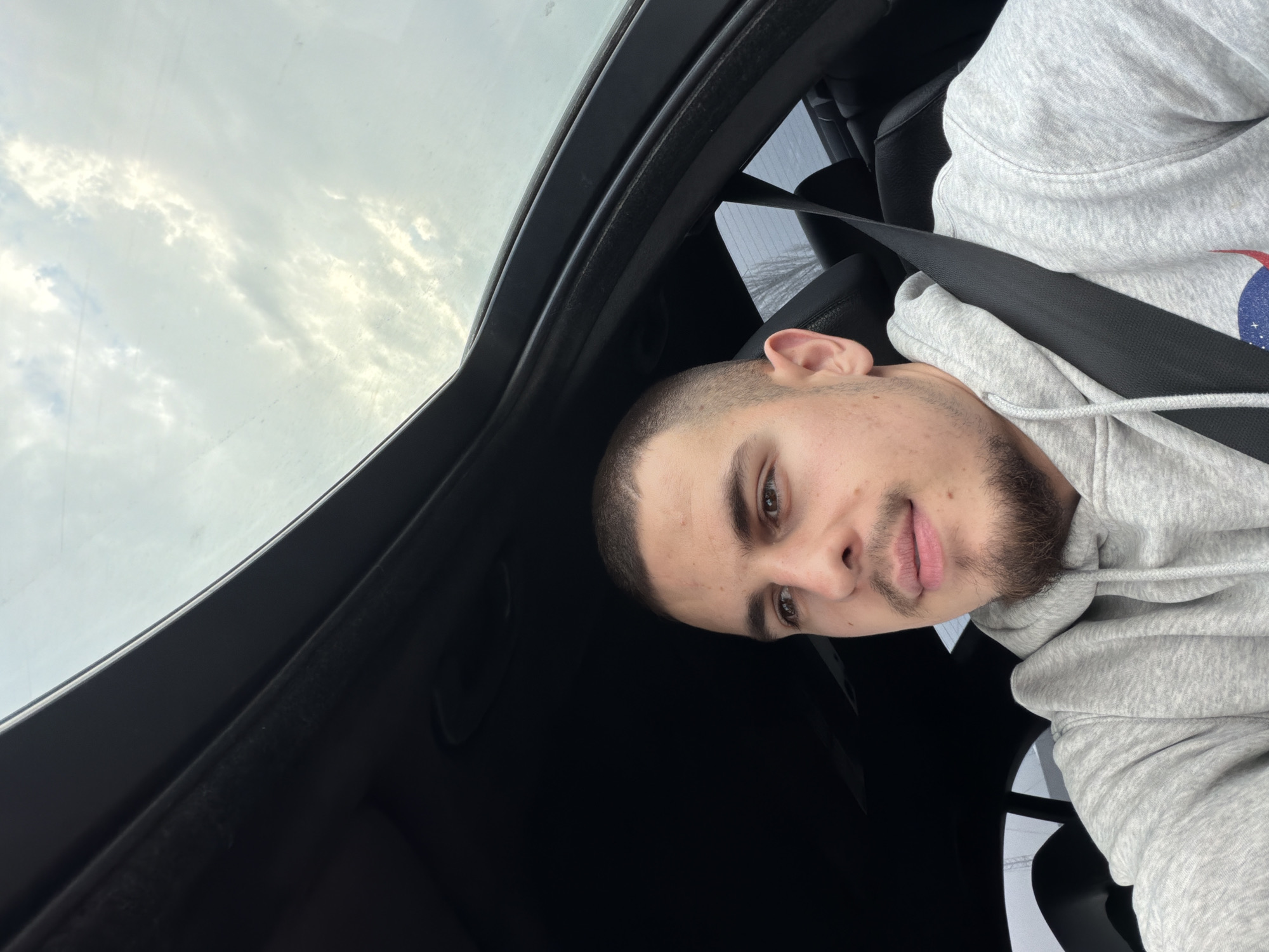 A male individual is observed seated in the driver's position within a vehicle in Plovdiv, Bulgaria. He is a young adult with a short buzz-cut hairstyle, light brown eyes, and a short beard with stubble. His gaze is directed towards his right and slightly upwards. He is wearing a grey hooded sweatshirt featuring a partially visible graphic on the lower right, consistent with a NASA logo (red, white, and blue elements visible). A black seatbelt is securely fastened across his left shoulder and chest. The vehicle's interior features dark upholstery and trim, with a sunroof overhead revealing an overcast sky with bright cloud formations. Through the rear window, bare tree branches are faintly visible against a hazy, lighter background.