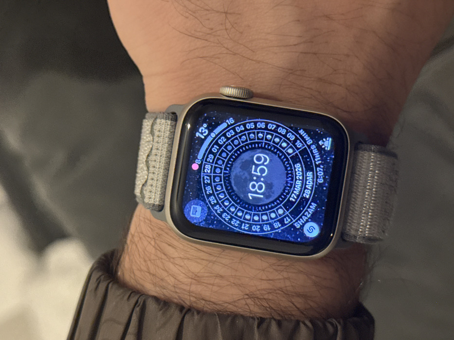 The scene depicts a close-up of a person's left forearm and wrist, positioned in the city of Boston, United Kingdom. The individual has light-toned skin covered with fine dark hair and wears a dark-colored padded jacket, visible on the left side of the frame. An Apple Watch, with a silver casing and a gray woven sport loop band, is worn on the wrist. Its digital crown is visible on the right side of the watch. The watch face, set against a starry background, displays the time 18:59, the Gregorian date 17 MAR 2026, and the Hebrew date 28 ADAR. The ambient temperature is indicated as 13° Celsius in the upper right. Additional complications include a message or mail icon in the upper left, a small pink dot, the Shazam application icon in the lower left, and a sunrise/day length reading of "6:07, 11HRS 8MIN." A circular graphic illustrating the lunar cycle encircles the central time display. The background is a blurred, indistinct field of gray and dark tones, offering no further specific environmental identifiers.