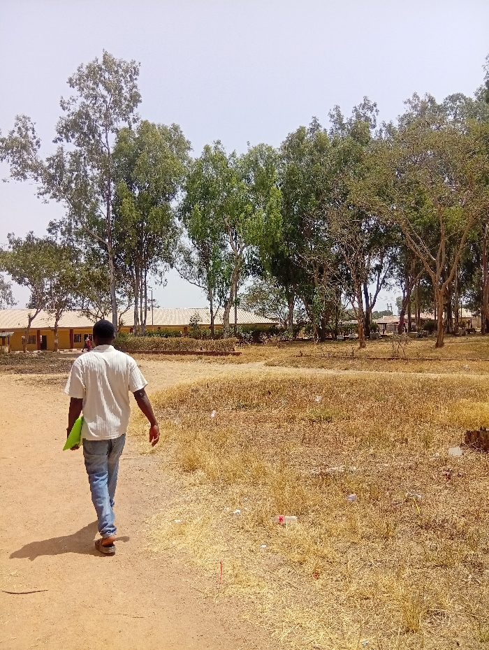 An outdoor scene in Ban, Nigeria, depicts a lone male subject walking away from the camera along an unpaved, reddish-brown dirt path. The subject, a dark-skinned male, wears a light-colored short-sleeved collared shirt, blue denim jeans, and brown sandals, carrying a bright green folder or book in his left hand. To the right of the path, the ground is covered in dry, yellowed grass and scattered litter, including plastic containers. The background features several low-rise buildings with light-colored walls and reddish roofs, partially obscured by numerous trees with varying foliage density, some lush green, others sparser. The sky above is a pale, bright blue. The environment suggests a dry, possibly arid, season and an institutional or campus-like setting.