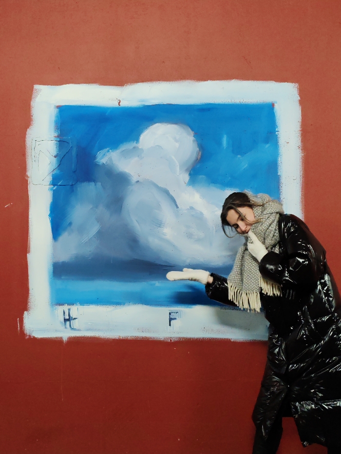 The scene captures a young adult female interacting with a street art mural on a reddish-brown wall at Hanzas iela 2F, Riga, Latvia. The mural, framed by an irregular white border, depicts a blue sky filled with white, cumuliform clouds. Dark capital letters 'H' and 'F' are stenciled onto the bottom left and right of the white border, respectively. The female, positioned to the right of the mural, wears a shiny black mid-thigh length puffer coat, a light grey patterned scarf with tassels, and light-colored gloves. Her left arm is extended towards the center of the mural, with her gloved palm open and facing upwards, positioned beneath a painted cloud. Her head is tilted downwards and to her left, observing her extended hand, while her right hand touches her chin. The subject is engaged in a posed interaction with the painted sky.