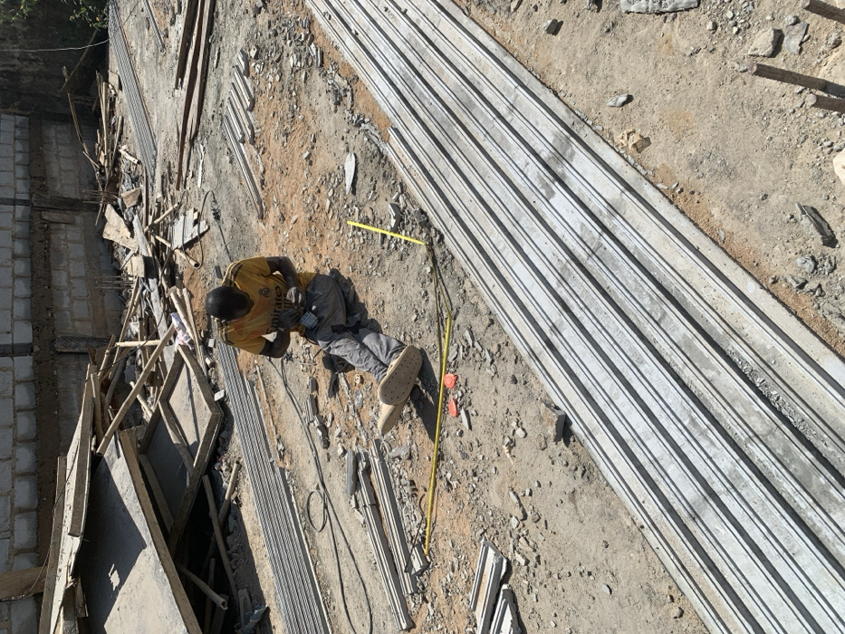 The image depicts an outdoor construction site in Abuja, Nigeria, under bright daylight