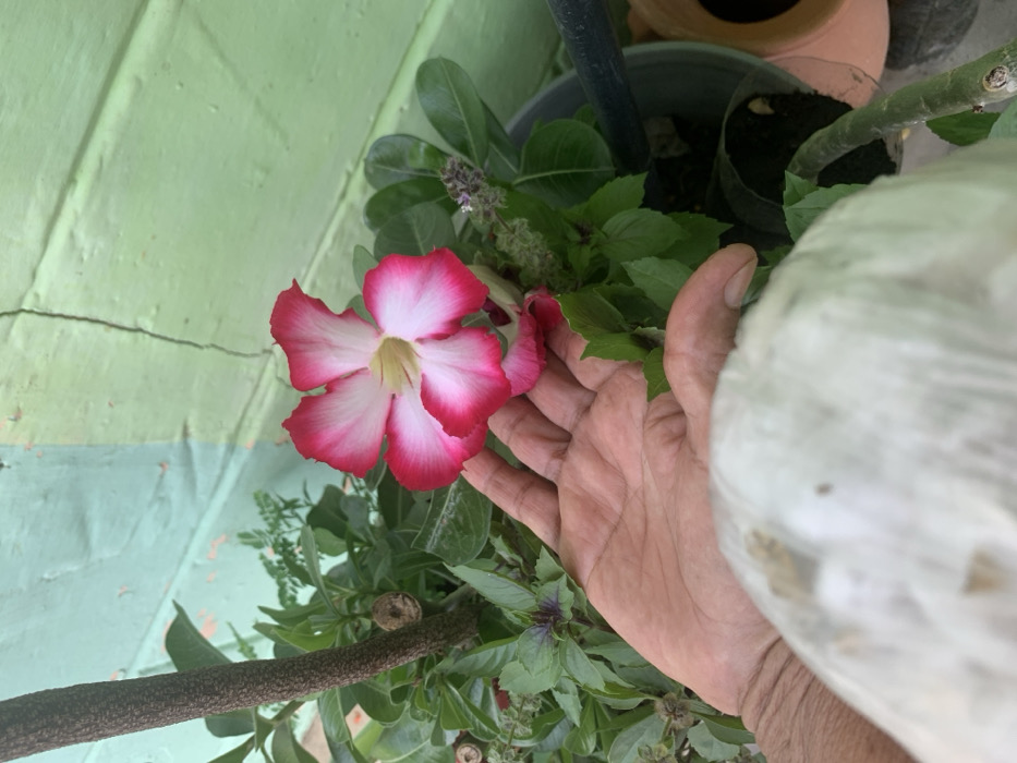 A vibrant pink and white adenium flower stands out amidst green foliage. A hand partially obscures the view, with another plant visible in the background. The composition is an elevated view, set against a green painted wall. Two pots can be partially viewed in the background. The overall aesthetic is natural and colorful, highlighting the beauty of the desert rose.