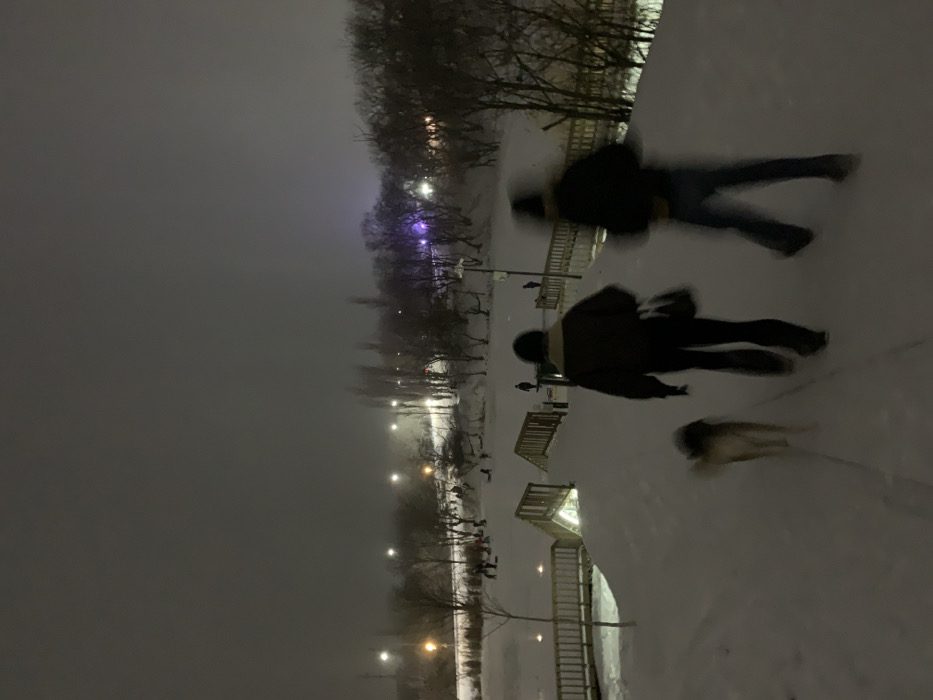 A snowy night scene shows two blurred figures walking alongside a dog. The path, partially illuminated by streetlights, leads into the distance where trees and more lights are visible. A fence runs along the edge of the path. The sky is overcast and gray. The overall scene conveys a sense of winter stillness.