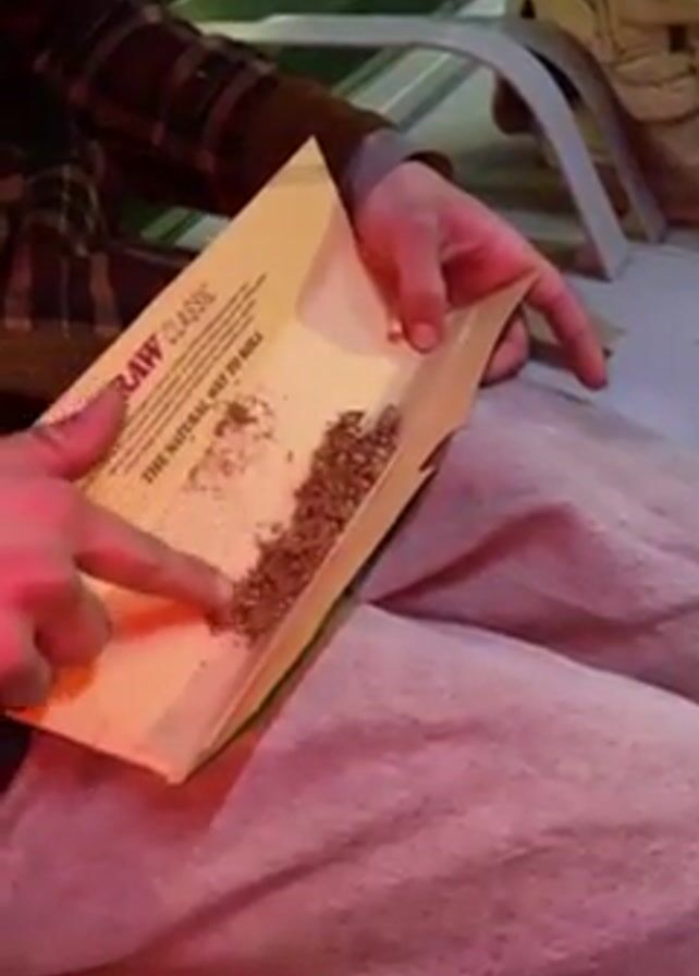 A person wearing a brown plaid shirt and light-colored sweatpants is seated, holding a yellow RAW CLASSIC rolling tray. The tray contains a pile of brown, shredded material. The person uses their finger to spread the material across the tray. Another person's hands are briefly visible as they adjust an object out of frame.