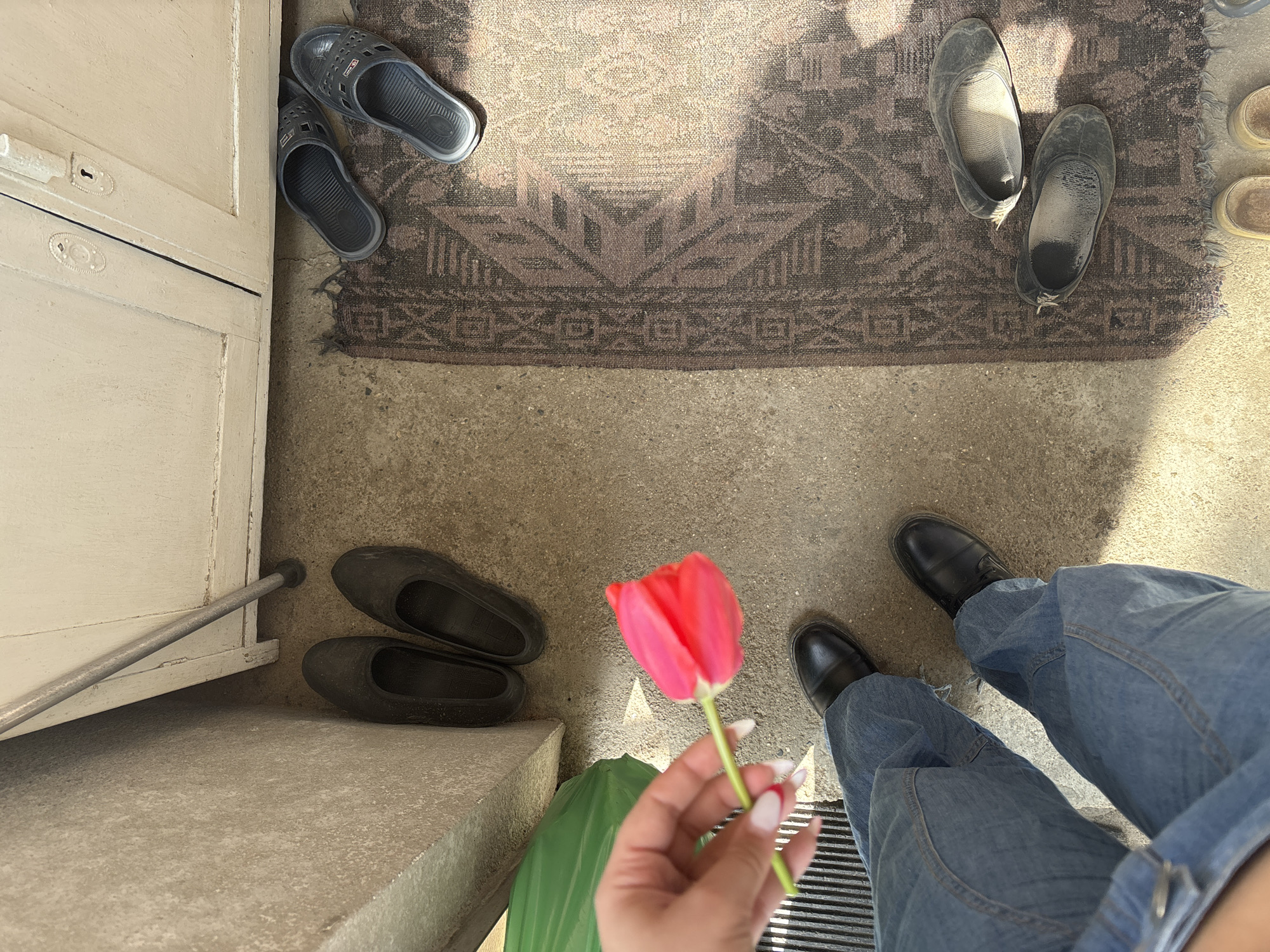 The scene appears to be a doorway entrance to a residence in Banya, Bulgaria. A person stands just inside, wearing black leather shoes and light-wash denim pants, holding a single red tulip flower. The hand holding the flower has manicured nails. At the doorway entrance is a collection of footwear: two pairs of black rubber shoes, a pair of grey sandals, and a pair of weathered slippers resting on an outdoor rug. The rug lies on a concrete floor. The door, painted in a light cream or off-white color, is ajar. Beside the door are the shoes and a large green bag.