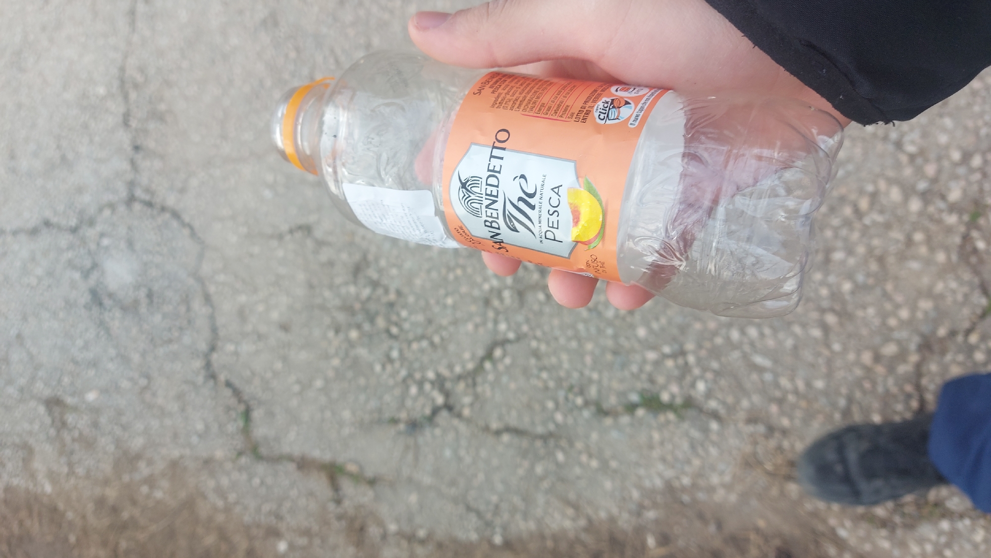 - "A light-skinned right hand is holding a partially crumpled, clear plastic bottle of San Benedetto Thè Pesca (Peach Tea) in an outdoor setting" by FM-YxgCI2, licensed under CC BY 4.0