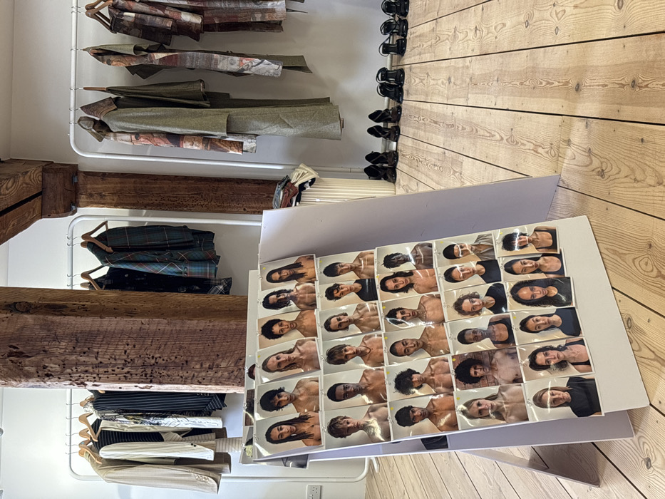 This image captures an interior scene, likely a fashion showroom or studio, located within a historic or industrially converted building, characteristic of areas such as Shoreditch or Spitalfields in London, United Kingdom. The foreground features a white, A-frame display stand angled towards the viewer, holding 36 laminated portrait photographs arranged in six rows of six. These photographs depict diverse young individuals, many with bare torsos, and some featuring distinct white markings on their faces. In the midground and background, multiple white garment racks are present. A rack on the left displays various articles of clothing, including light-colored blazers, striped shirts, and patterned garments, all suspended on wooden hangers. A prominent, dark, rough-hewn wooden structural beam extends from the ceiling to the floor near the center. To its right, another white garment rack holds additional clothing, including a long olive-green coat, trousers, and various patterned fabrics on wooden hangers. Below this rack, a precise row of eight pairs of women's shoes, consisting of dark brown closed-toe heels, black open-toe heels, and black strap heels, is arranged on the light-colored wooden floorboards. The walls are white, and an electrical outlet is visible on the lower left wall.