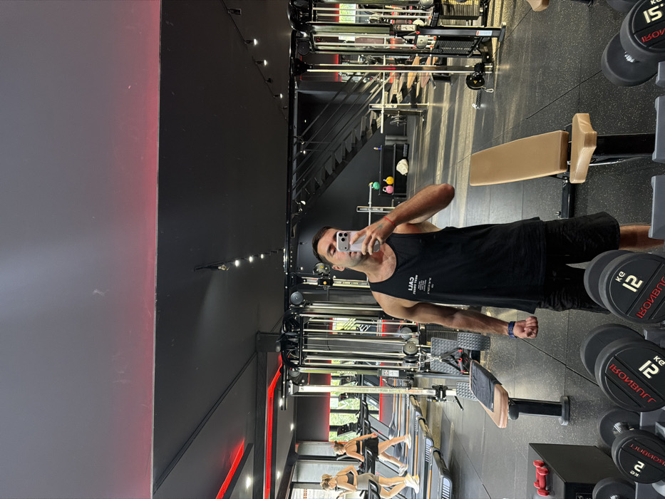 The scene depicts the interior of a modern gym located in Peliatan, Indonesia. A male individual, appearing to be in his 30s, stands centrally in the midground, capturing a mirror selfie with a light-colored smartphone held in his right hand. He wears a black tank top with partial white lettering (including "CALI" and "NEW YEAR?"), black shorts, a blue smartwatch on his left wrist, and a red bracelet on his right wrist. His left arm is slightly flexed with a closed fist. In the immediate foreground, a dumbbell rack displays several "IRONBULL" dumbbells, prominently showing 12 KG weights. The gym features a dark aesthetic with black walls and ceiling, accented by red strip lighting along the upper perimeters and recessed spot lighting. The floor is dark, likely rubber matting. To the left of the central figure, large windows reveal greenery outside. In the background on the left, two female individuals are actively using treadmills; one wears a light grey sports bra and shorts, the other a black sports bra and shorts. To the central figure's right, a light brown adjustable weight bench is visible. Further back, various black and silver cable machines and weight racks populate the space. A black staircase with open risers ascends in the distant background on the right, and several colorful kettlebells (yellow, green, blue) are situated on the floor near a barbell.