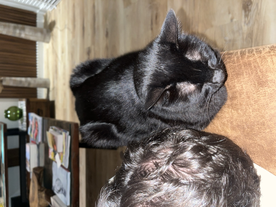 - "An indoor scene in Ras Al-Khaimah, United Arab Emirates, depicts a black cat and the top of a person's head resting closely together on a textured brown surface" by FM-leUqa2, licensed under CC BY 4.0