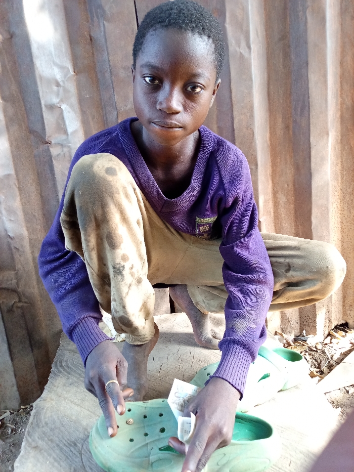 In Zango-ndaji, Nigeria, a young individual is depicted in a squatting position outdoors. The subject has dark skin, short dark hair, and wears a purple long-sleeved sweater and light brown, soiled trousers, and is barefoot. A golden ring is visible on the subject's left index finger. The subject looks directly forward with a neutral expression. Both hands are positioned over a pair of light green, perforated slip-on shoes resting on a rough-hewn wooden surface. The left hand is near a small, round, metallic object embedded in one shoe, while the right hand holds a small piece of white paper or currency over the other shoe. The background features vertically oriented corrugated metal sheeting exhibiting signs of wear and rust.