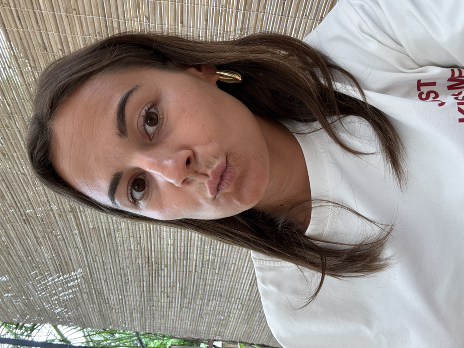 A female subject is depicted in a close-up, frontal view, centered in the frame. She has medium-length dark brown hair, brown eyes, and fair skin. Her lips are pursed forward in a distinct puckered expression. She is wearing a white t-shirt, with partially visible red lettering on the lower right side that reads "JUST KISS ME." A single gold-colored, semi-hoop earring is visible in her right ear. The background consists of a light-colored, horizontally woven or slatted bamboo screen. To the left, behind the screen, dense green foliage is visible, indicating an outdoor or semi-outdoor environment. The scene is located in Kabalana, Sri Lanka.