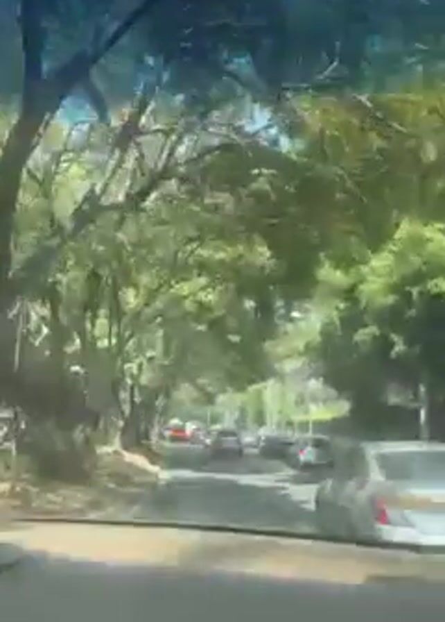 The video depicts a car driving on a road lined with trees. The view is from inside the car, looking out through the windshield. Other cars are visible on the road, both ahead and to the side. The trees create a canopy over the road, and sunlight filters through the leaves. The car's dashboard is visible at the bottom of the frame.