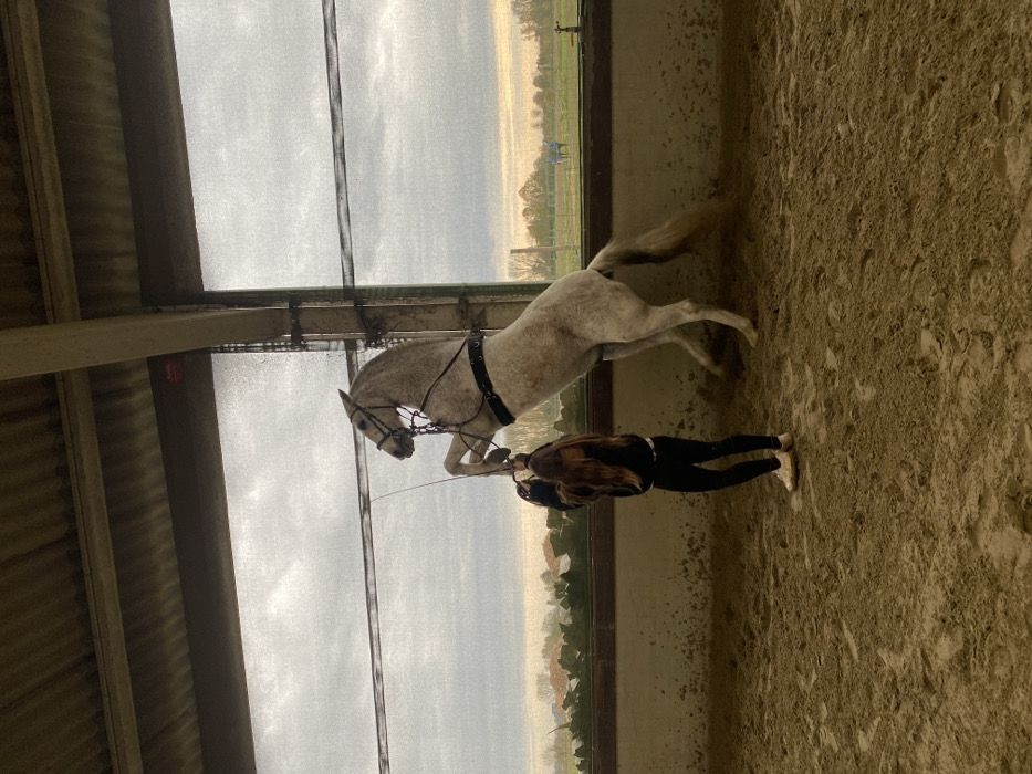 This image depicts an indoor equestrian arena located in Estaimpuis, Belgium. A light grey horse is captured mid-action, rearing upright on its hind legs, its front legs lifted and bent at the knees. The horse is equipped with a bridle and a black lunging harness. A female individual, seen from behind, is positioned to the left of the horse, holding a lunge line connected to the horse's bridle. She has long brown hair and is wearing a dark long-sleeved top, dark pants, and light-colored shoes. The arena floor consists of packed sand. The structure features overhead support beams and large windows or screens along the far wall, offering a view of an overcast sky and a green field with distant trees.