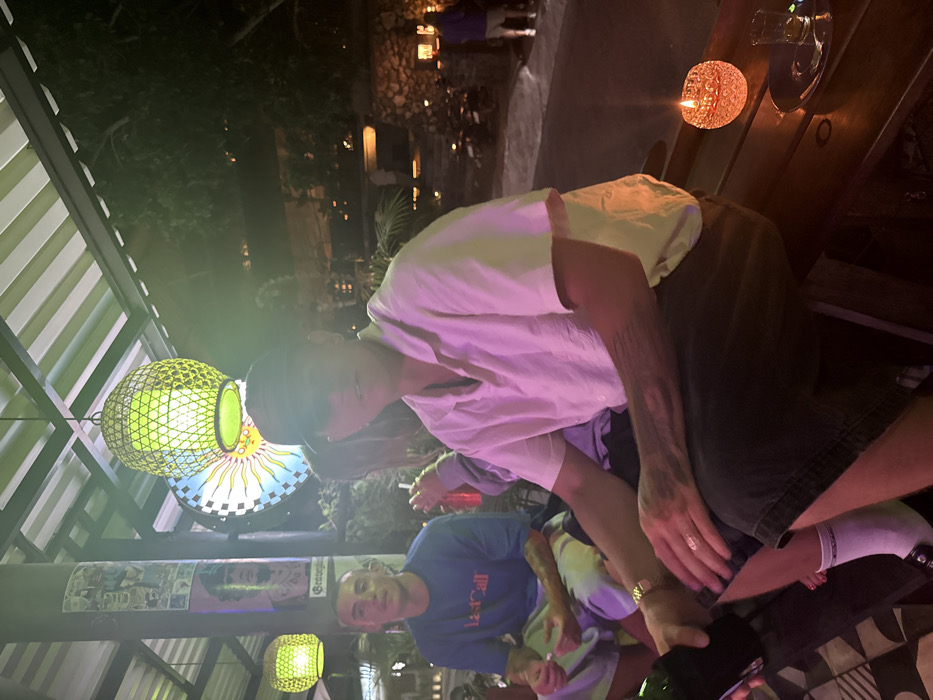 The scene depicts a nighttime gathering at an outdoor or semi-outdoor establishment in Uluwatu, Indonesia