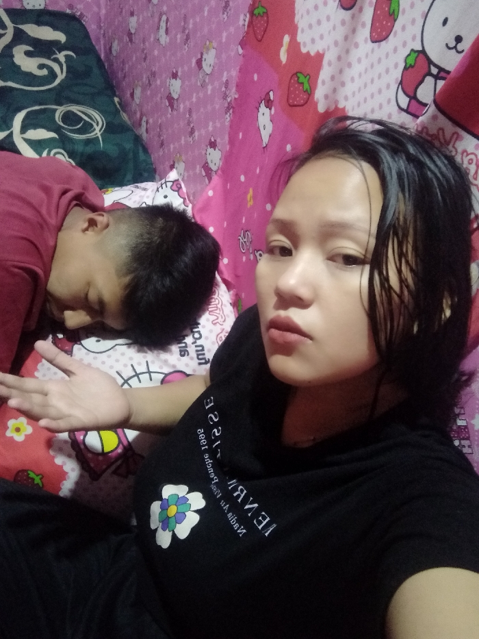 A woman poses for a selfie, lying down with her hair damp. She wears a black shirt with a flower design. Behind her, a person in a red shirt sleeps on a pillow with a Hello Kitty pattern. The bed is covered with themed bedding. The background includes a wall also decorated with Hello Kitty and strawberry motifs. The woman's expression appears somewhat exasperated.