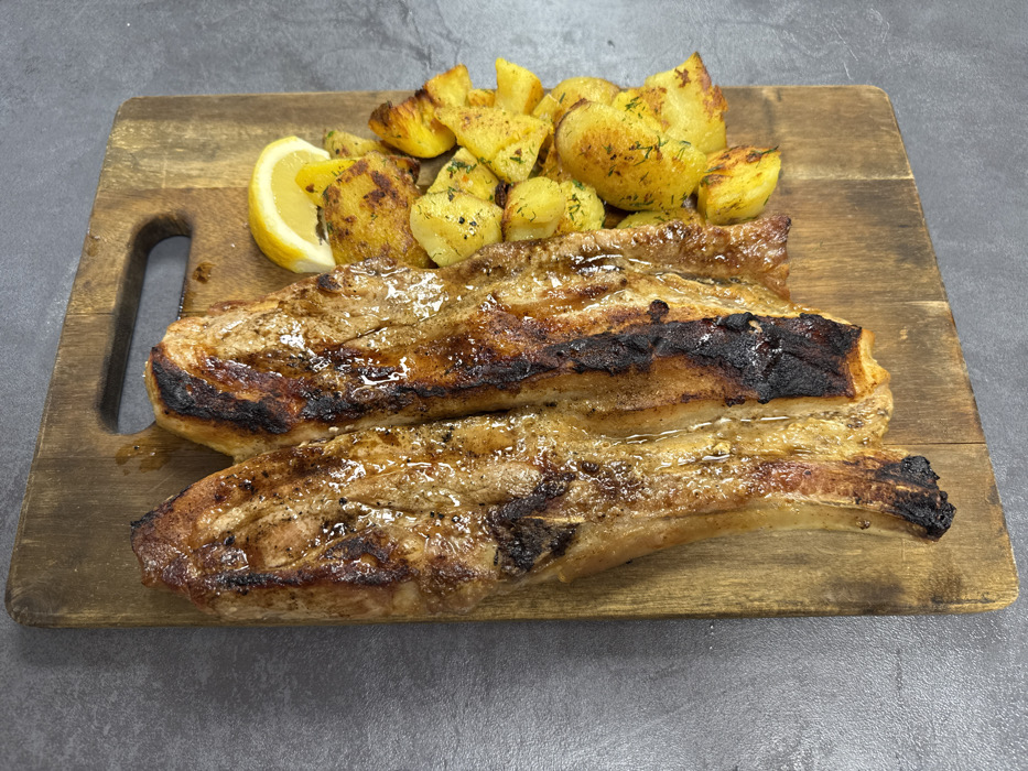 The image presents a culinary scene on a dark wooden cutting board, which rests upon a dark grey, textured surface. Two elongated pieces of cooked meat, likely pork, occupy the left side of the board. These cuts display a rich brown coloration with areas of charring, particularly along the edges, and a glistening, possibly glazed, surface. To the right of the meat, a heap of roasted potatoes is visible, characterized by their golden-brown color and the presence of scattered green herbs, consistent with dill or parsley. A single yellow lemon wedge is positioned at the top of the potato pile. The wooden board is rustic, featuring a rectangular cutout handle on its upper right quadrant, and shows minor wear consistent with use. No individuals are depicted, and no active interactions are occurring. The scene is located in Blagoevgrad, Bulgaria.