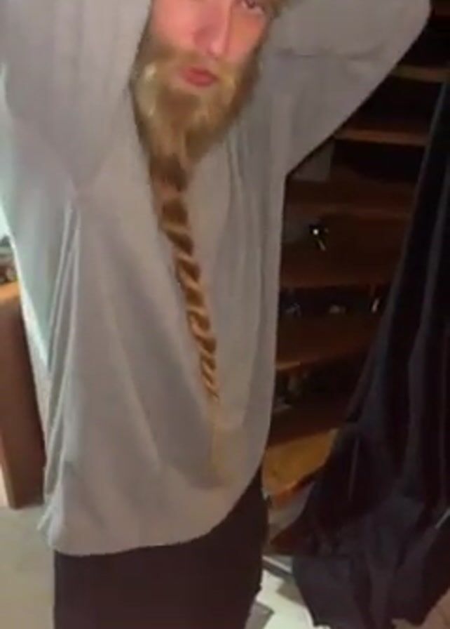 A man with a long braided beard is seen standing and then a quick camera pan reveals a set of drums, then the man is seen playing the drums