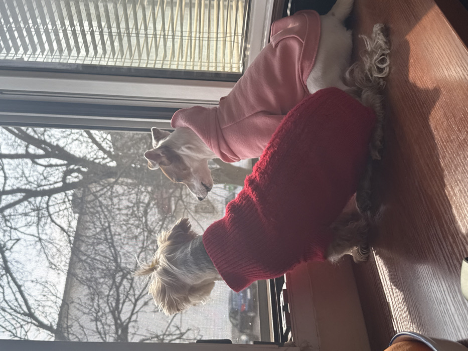 - "Two canines are situated on a polished reddish-brown windowsill, illuminated by strong sunlight casting prominent shadows" by FM-hP1Gh2, licensed under CC BY 4.0