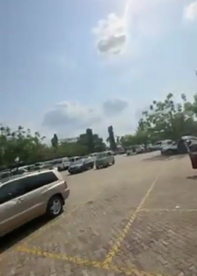 large outdoor parking lot on a sunny day. There are many cars parked in rows. The ground is paved with a pattern of interlocking blocks. A leafy tree provides shade in one area of the lot. In the background, buildings and a fence can be seen. The sky is blue with scattered clouds. The camera pans slowly across the parking lot.