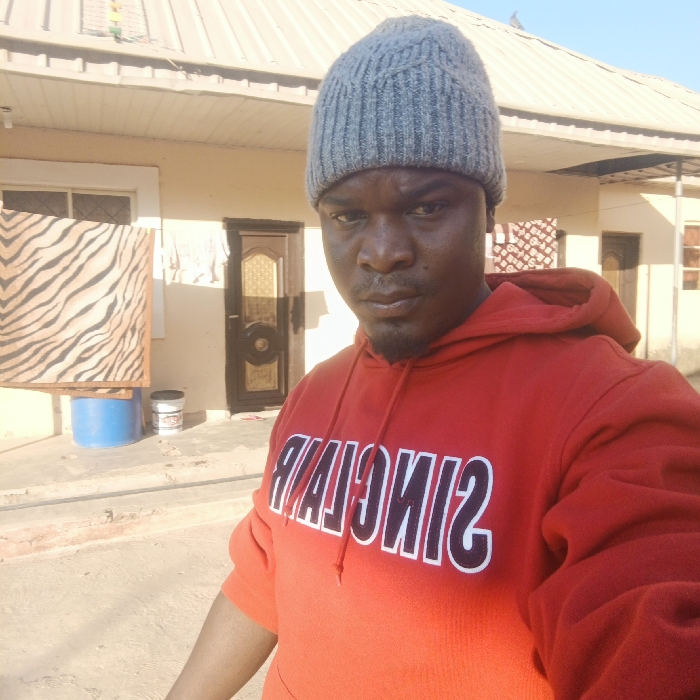 A man wearing a gray beanie and an orange hoodie with "SINCLAIR" printed backward in white and black is photographed outdoors. A light beige, single-story building with a metal roof is in the background. A zebra-striped blanket hangs on a blue barrel near a door. Sunlight illuminates the scene, creating shadows on the ground and side of the building. The man gazes towards the camera with a serious expression.