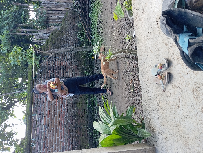 A woman in a garden holds a plate with food. She wears dark pants and a patterned top. Behind her, a brick wall stretches towards trees. An orange cat walks near a small tree. A concrete surface in the foreground displays sandals and a bag. Large green plants grow nearby.
