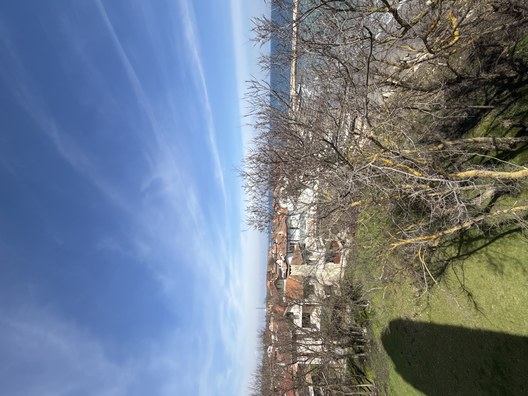 The image displays an elevated outdoor perspective of a coastal area within Shabla, Bulgaria, under a clear blue sky exhibiting sparse, wispy white clouds. The foreground features a vibrant green grassy slope, partially covered by a large, dark shadow cast from an unseen overhead object. Numerous deciduous trees with bare branches, some displaying yellow lichen growth on their bark, are situated across the midground, casting distinct shadows onto the grass. Beyond the trees, a cluster of residential buildings is visible, characterized by predominantly red or orange tiled roofs and light-colored facades; several structures include balconies. In the background, the calm blue water of the Black Sea stretches to the horizon. A concrete or stone pier/breakwater extends into the water from the right side, with indistinct white structures present near its base. No individuals, specific actions, or interactions are discernible within the frame.