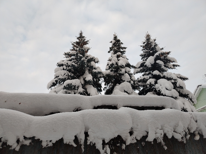 The image displays a winter scene in Прикамский, Russia. Three coniferous trees, heavily covered in thick white snow, are prominently featured against an overcast, light gray sky. In the foreground, a dark-colored barrier or fence is topped with an uneven, substantial layer of undisturbed snow, which exhibits several overhangs. The upper right corner reveals a portion of a building with light green siding and a snow-covered roofline, partially obscured by the rightmost tree. No individuals or animate subjects are present.