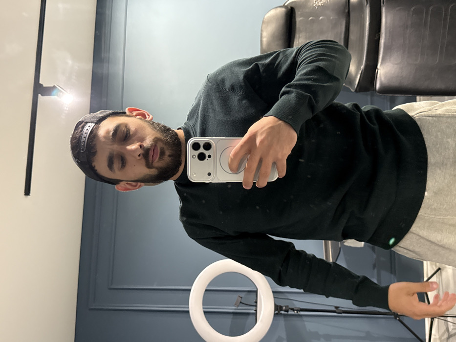 The scene is an interior room in Yerevan, Armenia. A male subject is reflected in a mirror, taking a selfie. He has a beard and is wearing a dark green long-sleeved top, light grey sweatpants, and a dark baseball cap worn backward. His eyes are closed. He holds a light-colored smartphone with a clear or white case featuring a MagSafe ring in his right hand, angled to capture his reflection. To the left of the subject's reflection, a white LED ring light is positioned on a black tripod stand. To the right, a black, high-backed adjustable chair is partially visible. The background consists of a blue-grey paneled wall. A black track lighting fixture with multiple spotlights is installed on the ceiling.
