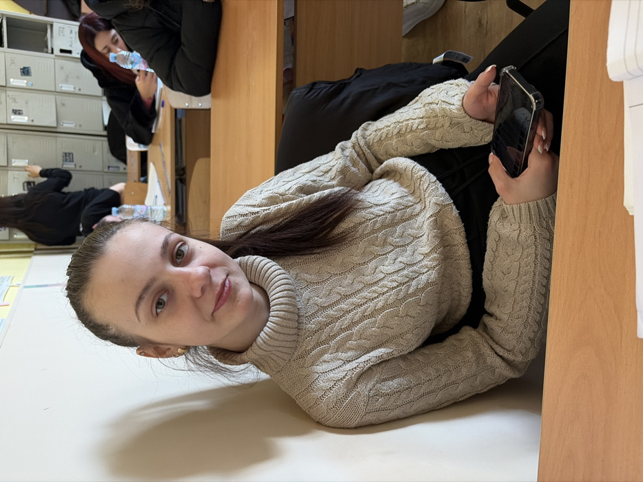 The image displays an indoor classroom setting, presumably within Cherven Bryag, Bulgaria. In the foreground, a young woman with light skin and dark hair, partially pulled back, is seated at a light-colored wooden desk. She wears a beige cable-knit turtleneck sweater and dark trousers. A small gold earring is visible in her left ear. She holds a dark-colored smartphone, encased in clear plastic, with both hands and looks directly towards the viewer with a slight smile. Her left arm rests against an off-white wall. On the desk directly in front of her are white papers or an open notebook. In the background, rows of similar wooden desks and dark chairs are visible. To the left-rear, a female individual, dressed in dark attire, is seen from behind, appearing to interact with a vertical stack of light-grey metal lockers or storage compartments mounted on the wall. Further to the right-rear, another female individual with dark hair, possibly with reddish highlights, is seated at a desk, facing away from the primary subject, with a clear plastic water bottle on her desk. A fourth individual, partially visible on the far right, wears a dark, padded jacket. The walls of the classroom are light-colored, featuring a yellow trim near the ceiling in the background.
