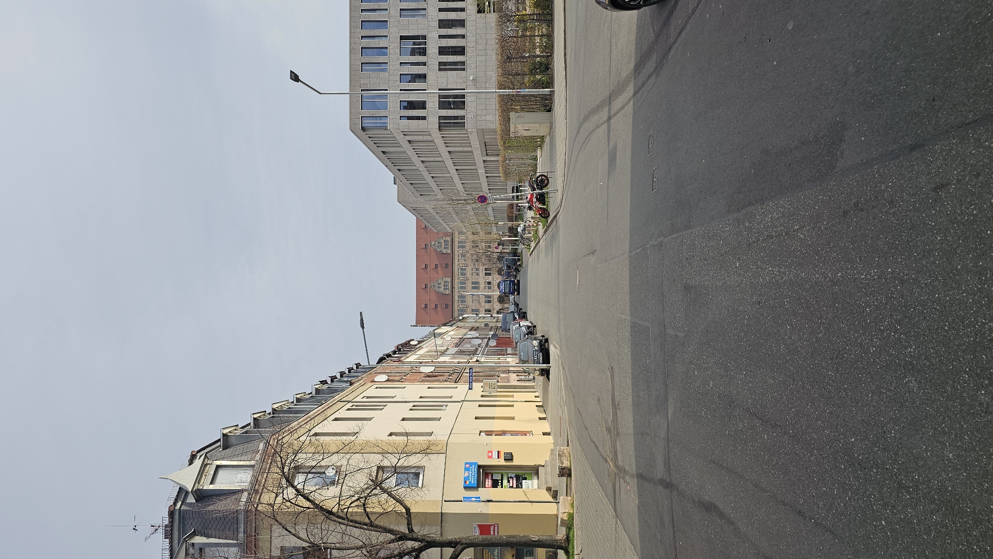 The image presents a daytime street scene on Franz-Klein-Straße in Nuremberg, Germany, looking eastward towards the Justizpalast Nürnberg. The sky is clear and light blue. No individuals are visible. On the left side, a row of multi-story buildings exhibits traditional European architecture. The closest building, on a street corner, is light yellow/beige with a dark grey mansard roof and an ornate peaked element. Storefronts are visible at its base, including one labeled "Supperl Bäckerei." A leafless deciduous tree stands in the foreground. Several vehicles, including a black Mercedes-Benz sedan, are parked along the left curb. On the right side, a multi-story modern building with a light grey facade composed of rectangular panels and numerous vertical windows dominates. Trimmed hedges line the sidewalk in front of this structure. A red motorcycle is parked on the sidewalk, near a "No Parking" sign (red circle with diagonal line) and a utility box. The asphalt road surface in the foreground displays visible patching and faint markings. Modern streetlights are positioned on both sides of the street. In the distant background, the large, historical Justizpalast Nürnberg, characterized by its reddish-brown tiled roof and multiple dormer windows, serves as a focal point at the end of the street. A blue truck and other vehicles are present further down the street, receding towards the palace.