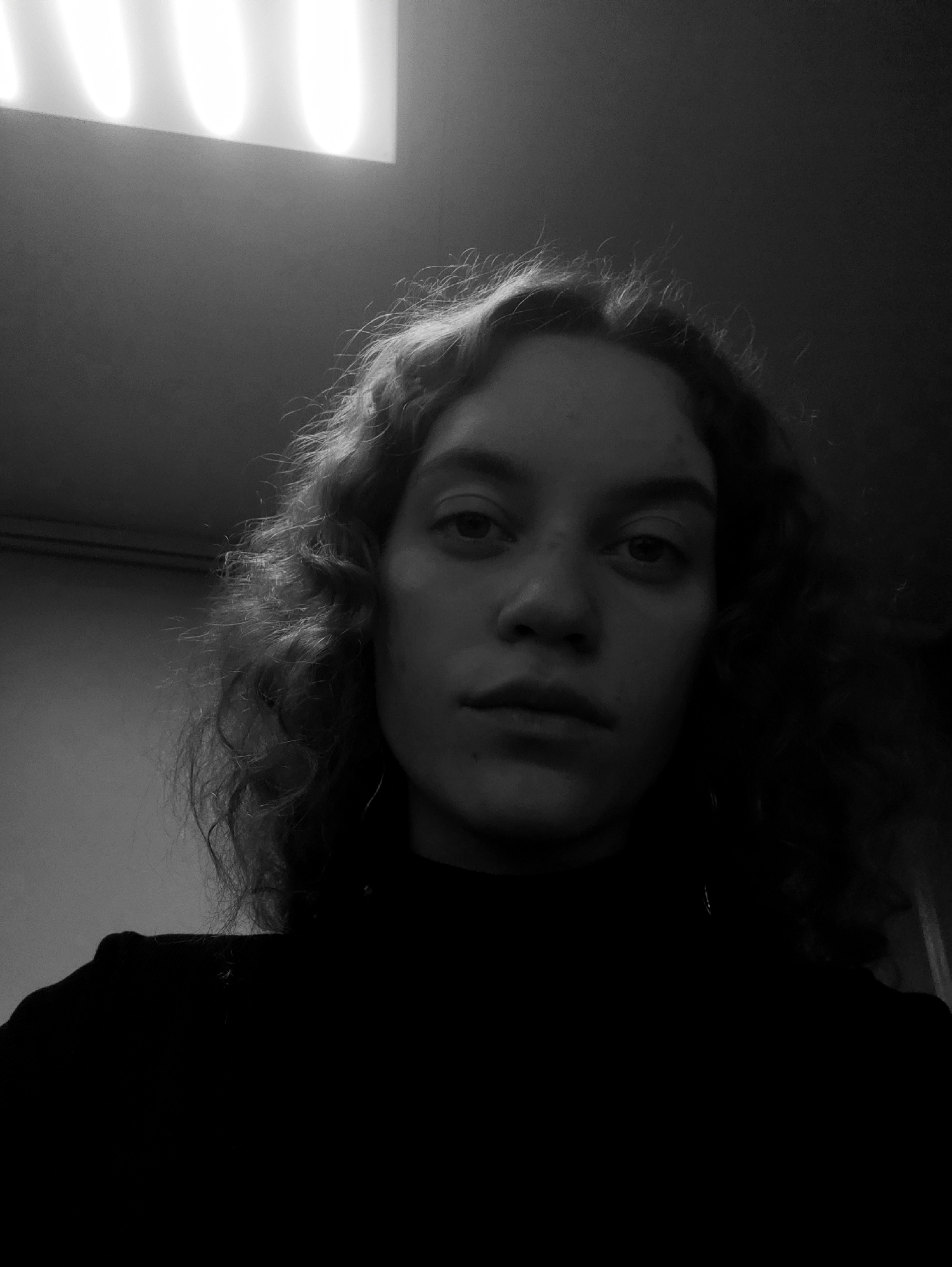 A black and white, close-up portrait of a person with curly hair, a neutral expression, and wearing a dark turtleneck sweater, taken from a low angle. Above the person is a rectangular light fixture. The environment appears to be indoors. The location is unspecified.
