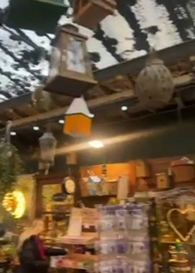 The video depicts an interior shot of a shop or market. The ceiling is covered with a translucent, possibly aged or textured material, supported by a metal framework. Numerous items are suspended from the ceiling, including birdhouses of various designs and lanterns. People are milling about, browsing the merchandise. The wares are a mix of greenery, small decorative items, and what appears to be gardening supplies. The overall lighting is bright, and the atmosphere appears festive and inviting. The camera moves, showing different sections of the shop.