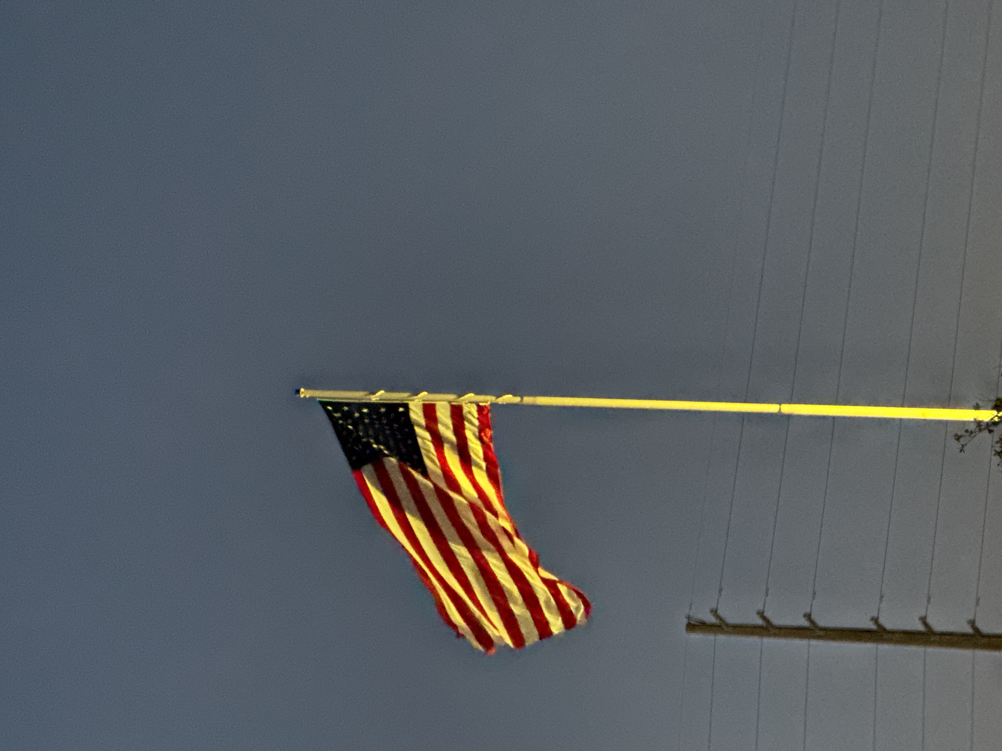 - "An American flag hangs limply from a horizontal pole against a grey sky" by FM-46qH52, licensed under CC BY 4.0