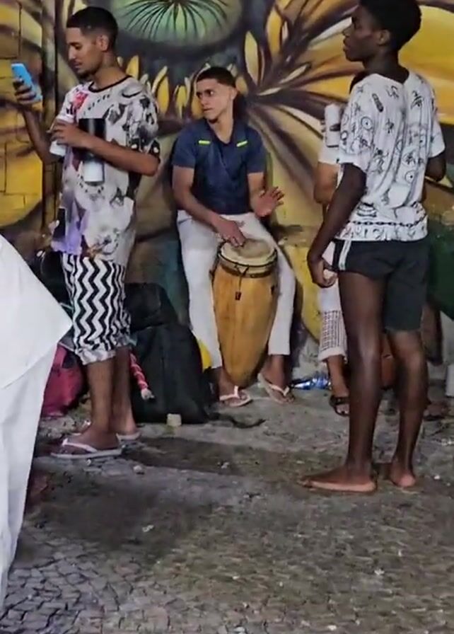 The scene presents a group of young men gathered on a cobbled street, positioned against a backdrop of a vibrant mural depicting a sunflower. A young man, seated, plays a conga drum, with others standing around him; one is holding a can and another is holding a mobile phone, appearing to take pictures or videos. The attire of the individuals is casual, with a mix of patterned shirts, shorts, and flip-flops. The environment suggests an urban setting, with the mural adding an element of artistic expression. The overall impression is of a casual gathering, possibly a spontaneous musical performance.