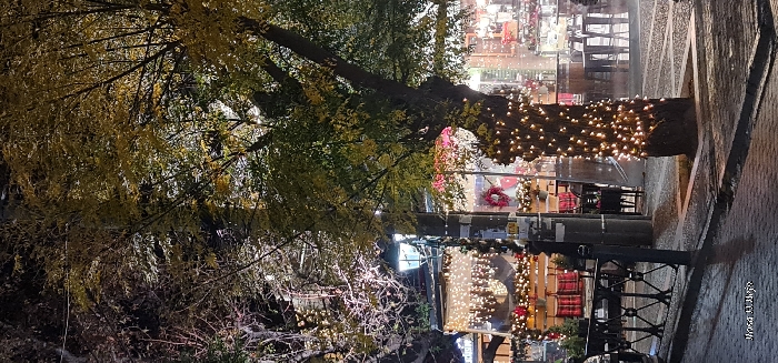 A tree trunk wrapped in many tiny lights is on the edge of a city street with a stone curb and sidewalk. The foreground has tree branches that have fall foliage. In the background, there are several decorated shops with bright windows and cafe tables and chairs. A black metal fence borders the scene in the mid-ground.