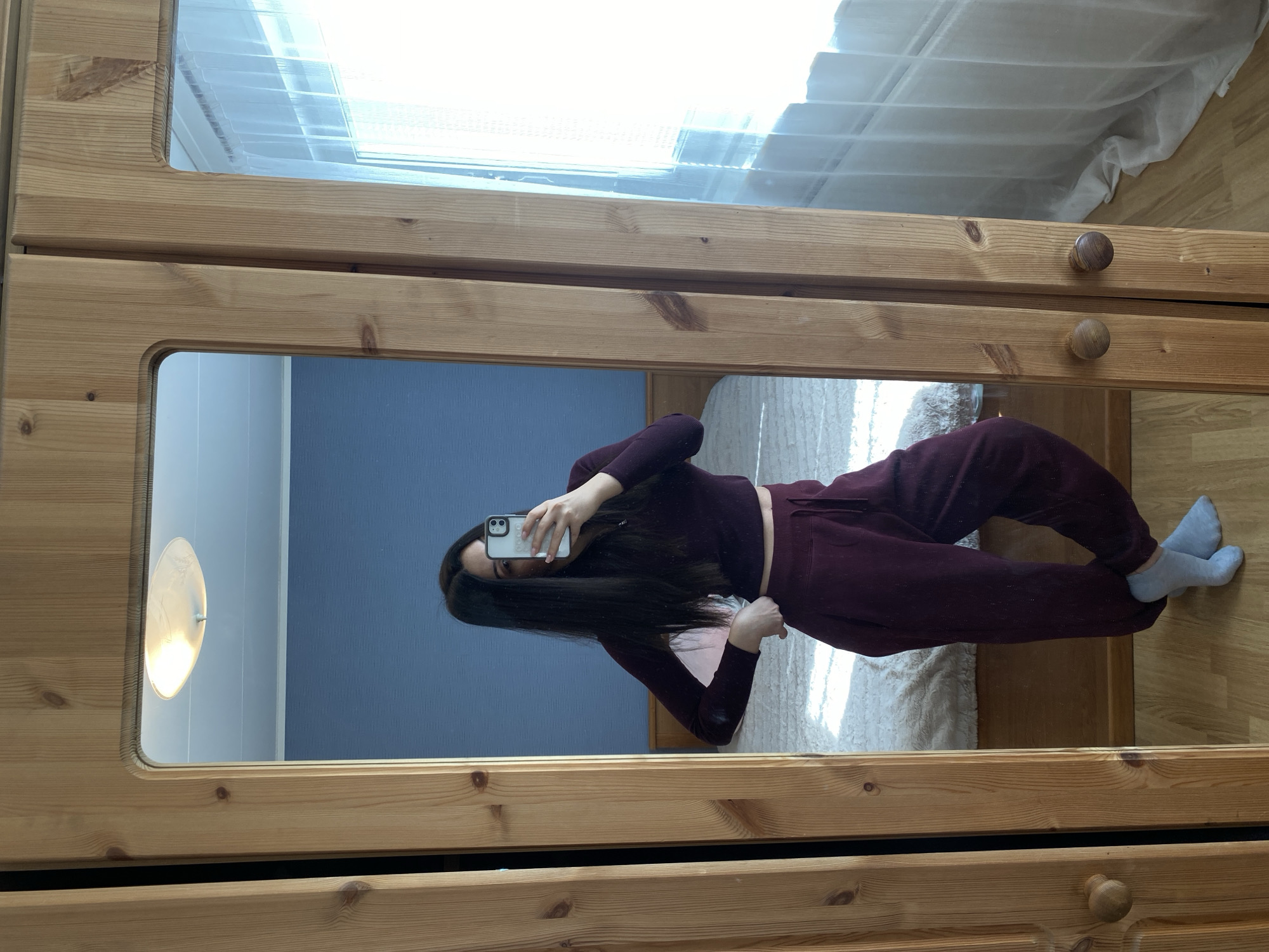 A woman stands in front of a large wooden wardrobe in a room. She wears a maroon colored two-piece outfit consisting of a crop top and sweatpants. The woman is holding her phone up to take a picture of herself in the mirror. The wardrobe has drawers with round wooden knobs. The room has a blue wall and a wooden floor. A window is visible in the reflection of the mirror. The location is Björklinge, Sweden.