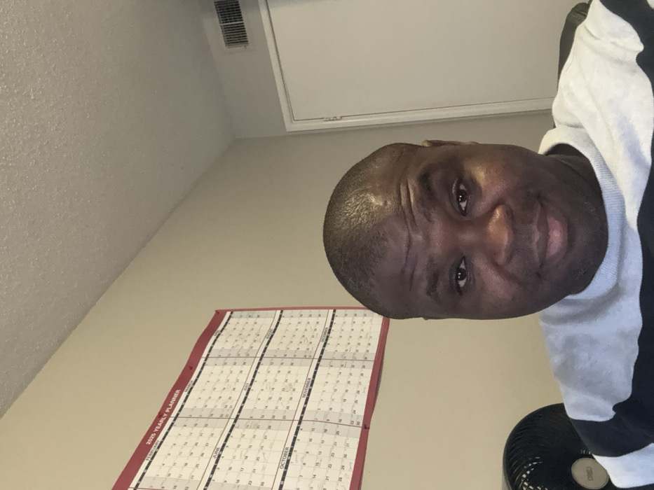A dark-skinned adult male is depicted in a medium shot, facing the camera with a neutral expression. He has a shaved head and is wearing a light-colored, long-sleeved shirt with dark horizontal stripes. The scene is an indoor environment, identified as a residential or office setting in Louisville, United States. To the left of the subject, a beige wall features a prominently displayed white 2023 yearly planner calendar with red borders. A portion of a black oscillating fan with a "DSD" logo is visible in the lower left corner. To the right of the subject, a light-colored door is present, with a rectangular HVAC vent situated above it on the beige wall. The ceiling is white and has a textured finish. No overt actions or interactions are occurring.