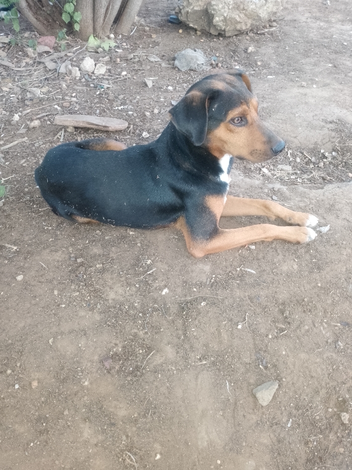 - "A tricolor dog, predominantly black with tan legs, snout, and eyebrows, and a white chest patch and paws, is observed lying on dry, light brown dirt ground in the city of Altagracia, Venezuela" by FM-jQr8z2, licensed under CC BY 4.0