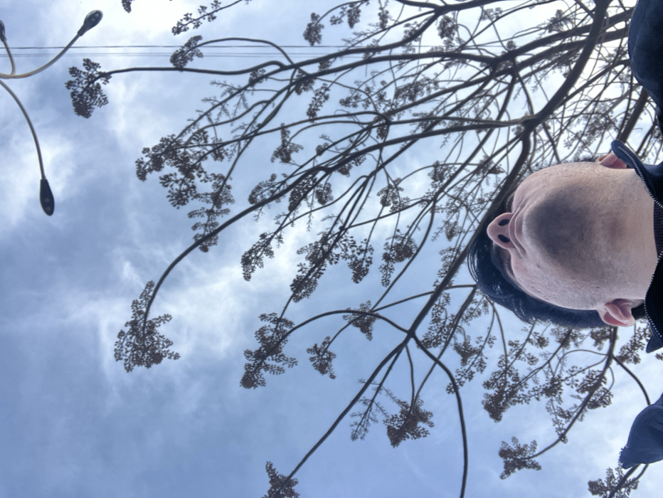 The scene is set in Namangan City, Uzbekistan, depicted from a low-angle perspective looking skyward. The upper two-thirds of the image show a light blue sky with scattered wispy white clouds. Numerous bare, deciduous tree branches, laden with dried clusters of seed pods or remnants of past inflorescence, are silhouetted against the sky, extending across the frame. Two modern streetlights with curved arms are partially visible in the upper right, along with thin, dark utility lines. In the lower third of the image, the head and upper shoulders of an individual are present. The individual, with dark hair and wearing a dark jacket, is looking upwards towards the sky and trees. No other persons, significant actions, or interactions are visible.