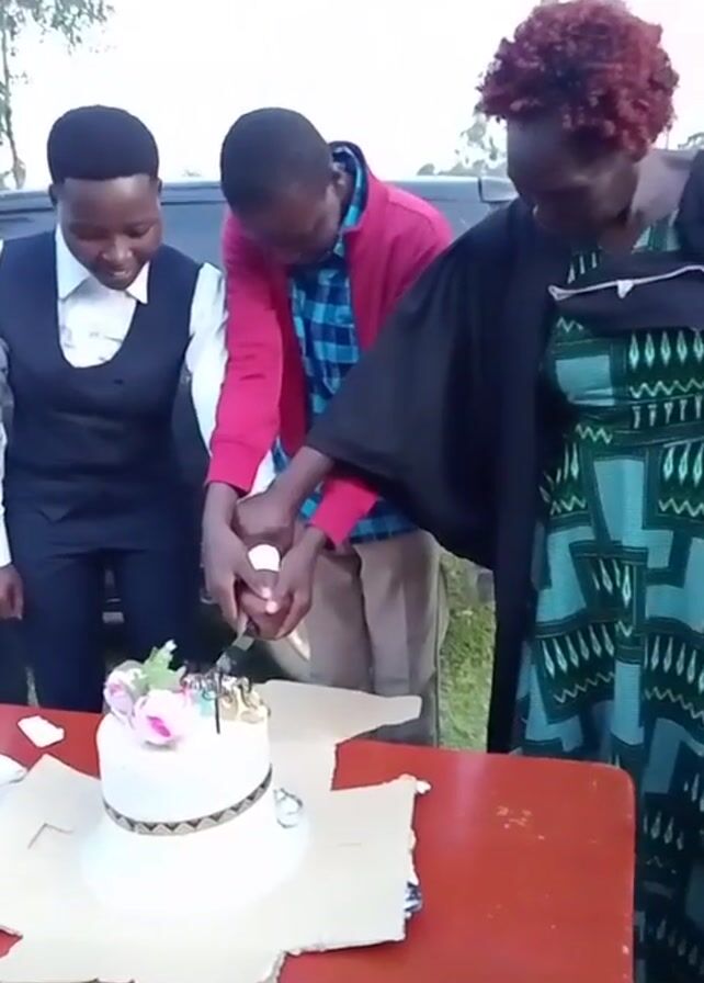 Three individuals are gathered around a small, two-tiered white cake decorated with pink flowers and candles on a red rectangular table. A person on the left, dressed in a white shirt and dark vest and pants, smiles as they watch the other two people cut the cake. The person in the middle, wearing a red sweater over a blue and black plaid shirt and khaki pants, holds the knife together with the person on the right. The person on the right is wearing a patterned green and black dress with a black robe over it. A dark-colored van is partially visible in the background. The event appears to be taking place outdoors in a grassy area. Another man can be seen in the background watching the cake cutting. There's a knife and plate on the table near the cake.