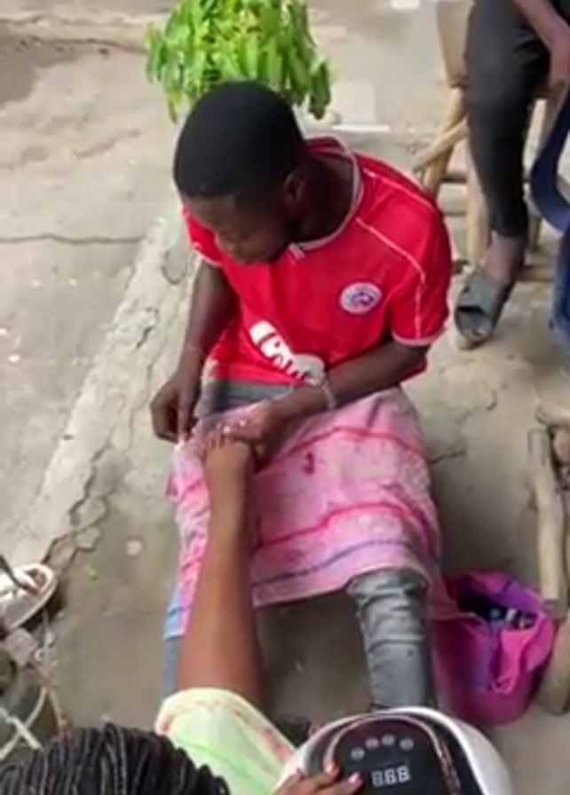 man giving a pedicure to a customer outdoors. The man is wearing a red sports jersey, grey jeans, and is sitting on a stool covered with a pink patterned towel. He is focused on tending to the customer's toes. The customer is reclined, with her foot resting on a light green patterned towel. Her nails are painted with nail polish. Next to the customer is a UV nail lamp. Another person is sitting on a stool in the background. The setting appears to be a casual outdoor area, with plants and concrete flooring visible.