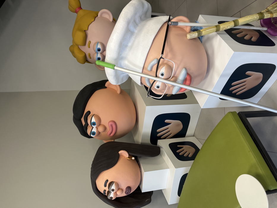 - "The image displays an indoor scene featuring four large, stylized, cartoon-like head sculptures arranged on white cubic pedestals of varying heights" by FM-Amqid2, licensed under CC BY 4.0