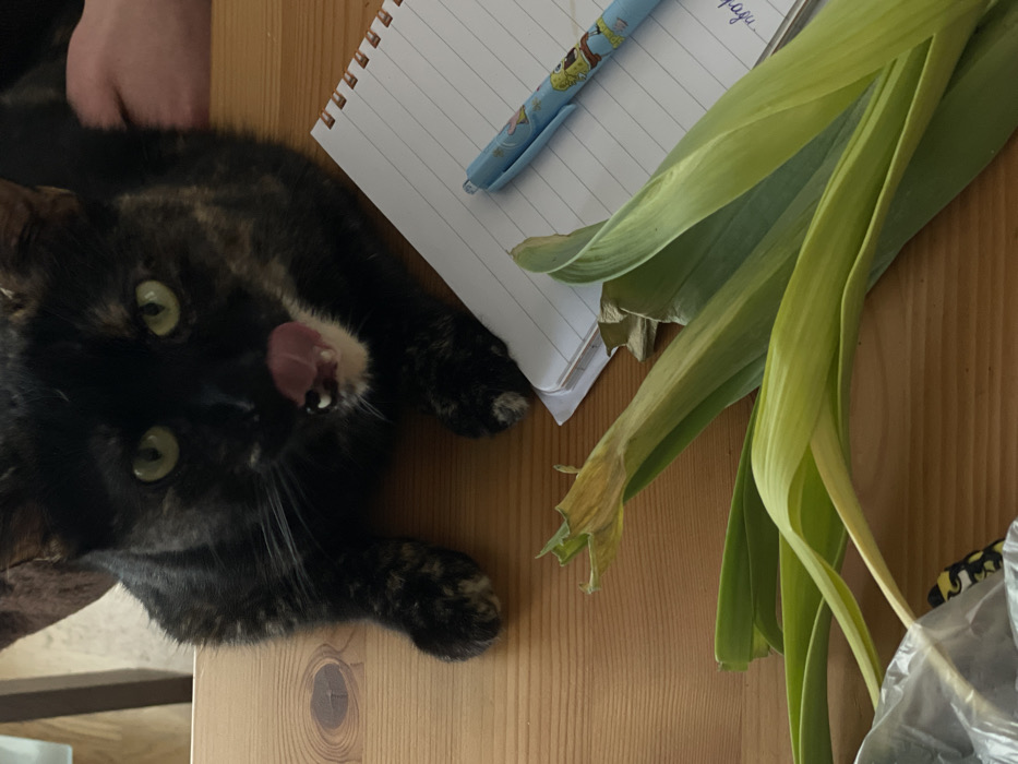 A tortoiseshell cat with dark fur, tan/orange patches, and green eyes is observed on a light wooden surface. The cat's mouth is open, with its pink tongue extended upwards. Its paws are resting on the table. To the cat's right, an open, spiral-bound notebook containing lined paper lies on the table. A light blue pen, decorated with Spongebob Squarepants characters, rests horizontally on the notebook. In the foreground, several long, green plant leaves, some exhibiting yellowed tips and minor damage, are spread across the wooden surface. A translucent plastic bag, containing a yellow and black patterned object, is partially visible in the bottom-left corner of the image. A segment of a human arm is visible in the upper-right background, behind the cat. The scene takes place in Rafailovići, Montenegro.