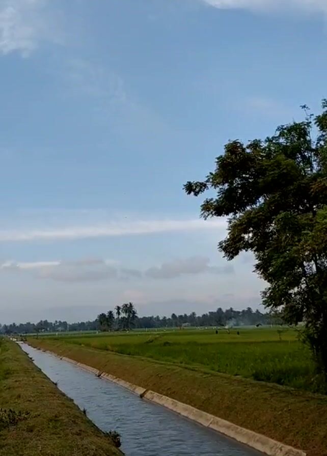A waterway in a concrete canal runs through a green rice field under a blue sky with some scattered clouds. In the distance are some trees and signs of human activity, with small figures moving around in the field. A tree is positioned on the right side of the frame, and its branches extend into the sky.