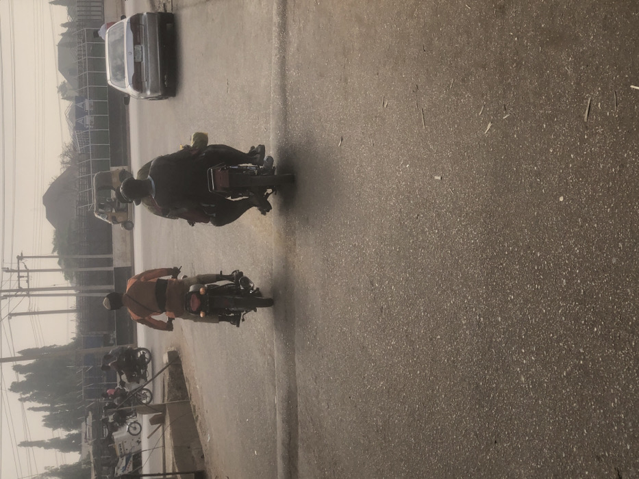 The image depicts a daytime street scene in Hanwa, Nigeria. Two motorcycles with multiple occupants are centrally positioned on a paved asphalt road, moving away from the camera. The motorcycle on the left carries a single rider dressed in an orange long-sleeved shirt, dark trousers, and a light-colored skullcap, with a dark bag across their back. The motorcycle on the right carries two individuals; the driver and passenger are both wearing dark clothing, and the passenger holds a yellow object, possibly a container or fruit. The road surface appears dusty. In the background, under a hazy sky, utility poles with overhead lines are visible. Other vehicles include a silver sedan parked or moving slowly on the right, a motorized tricycle (keke) in the center, and additional motorcycles on the far left. Distant trees and faint building structures are discernible.