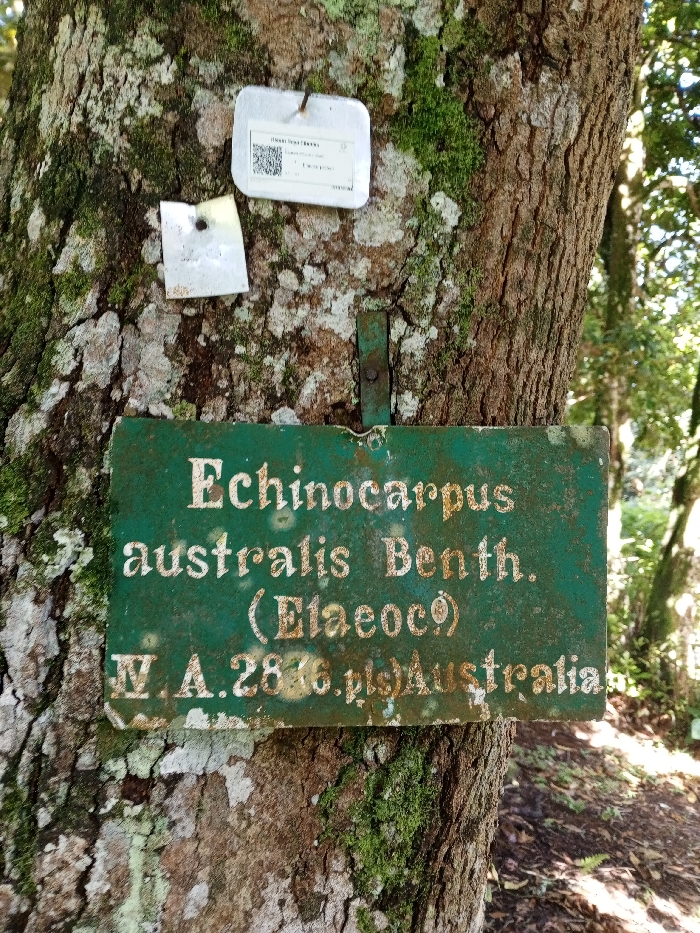 - "A weathered green sign affixed to a tree reads "Echinocarpus australis Benth" by FM-hlSDi1, licensed under CC BY 4.0