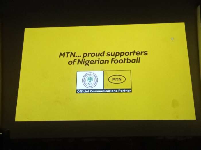 A projection screen dominates the frame, displaying yellow background with black text and logos. The primary text reads, "MTN... proud supporters of Nigerian football." Below this, two logos are presented: a circular logo for the "NIGERIA FOOTBALL FEDERATION" (established 1945), and an oval logo containing "MTN." Directly beneath these logos, the text "Official Communications Partner" is visible. A faint, inverted 'D' shaped mark is present in the upper right quadrant of the yellow display. The periphery of the image is dark, indicating an indoor environment, possibly a presentation room. No individuals, actions, or interactions are visible. This scene is located in Dabawa, Nigeria.