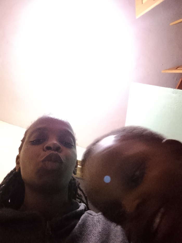 Two dark-skinned people pose closely, possibly taking a selfie. One person, positioned on the left, has dreadlocks and is wearing a gray hoodie. Their face is clear, and they're puckering their lips. The other person is mostly out of focus and cropped on the right side of the frame. The background includes a bright ceiling and part of a wall with shelves. The lighting is generally poor and bright.